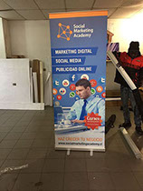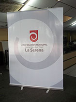 Porta pendón con estructura de aluminio. Grafica autoenrollable, permite grafica de diferentes materiales; papel, papel sintetico, tela PVC Armado facil.